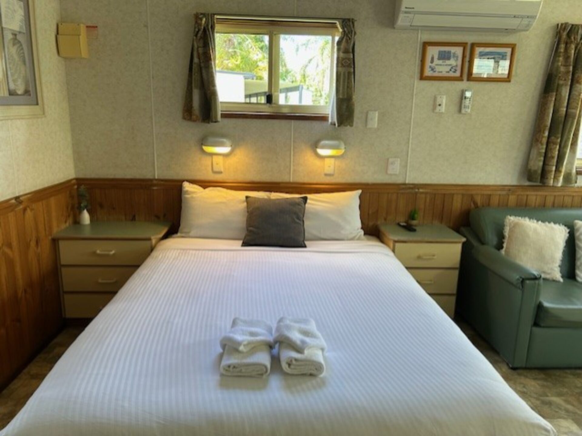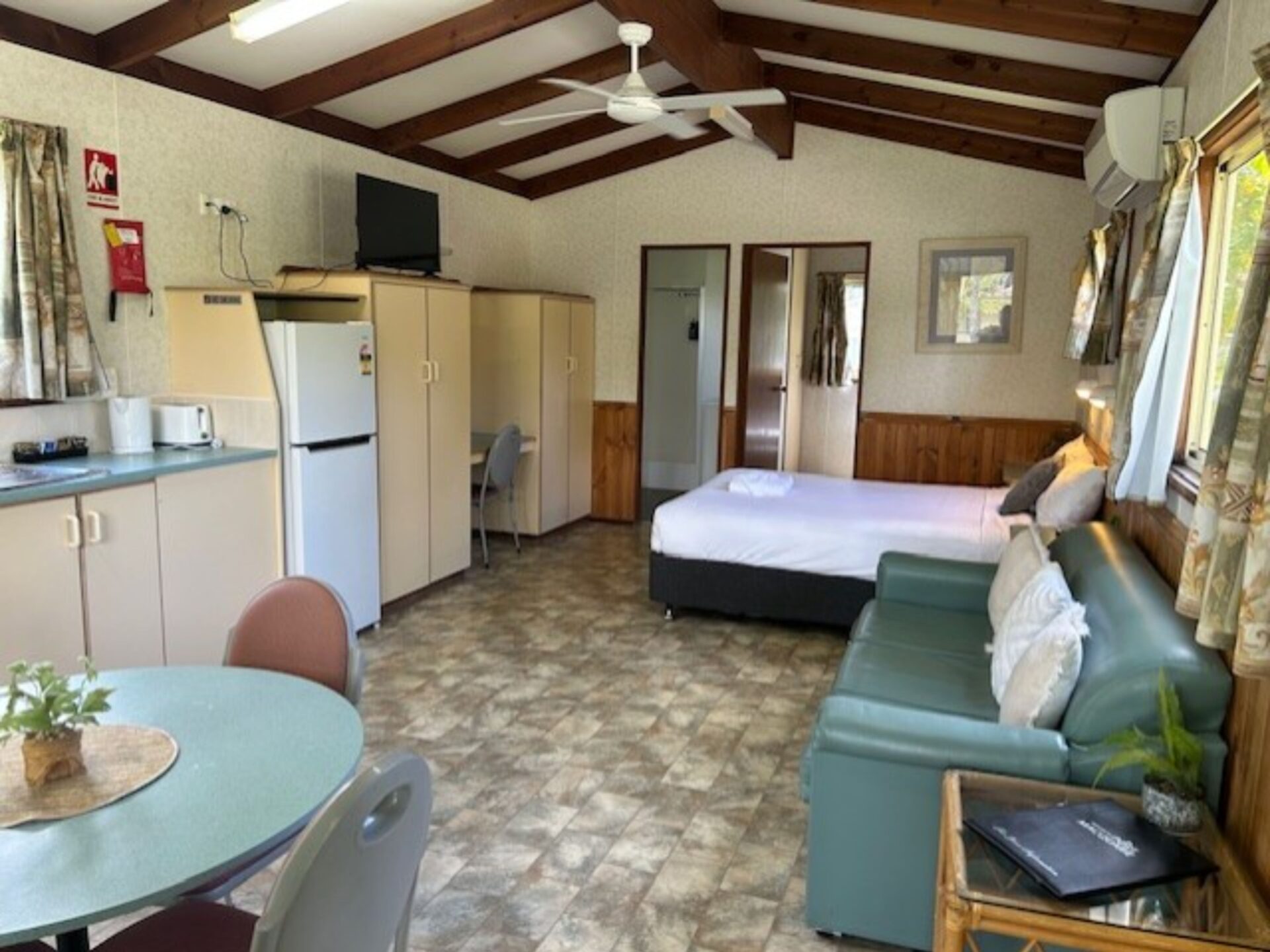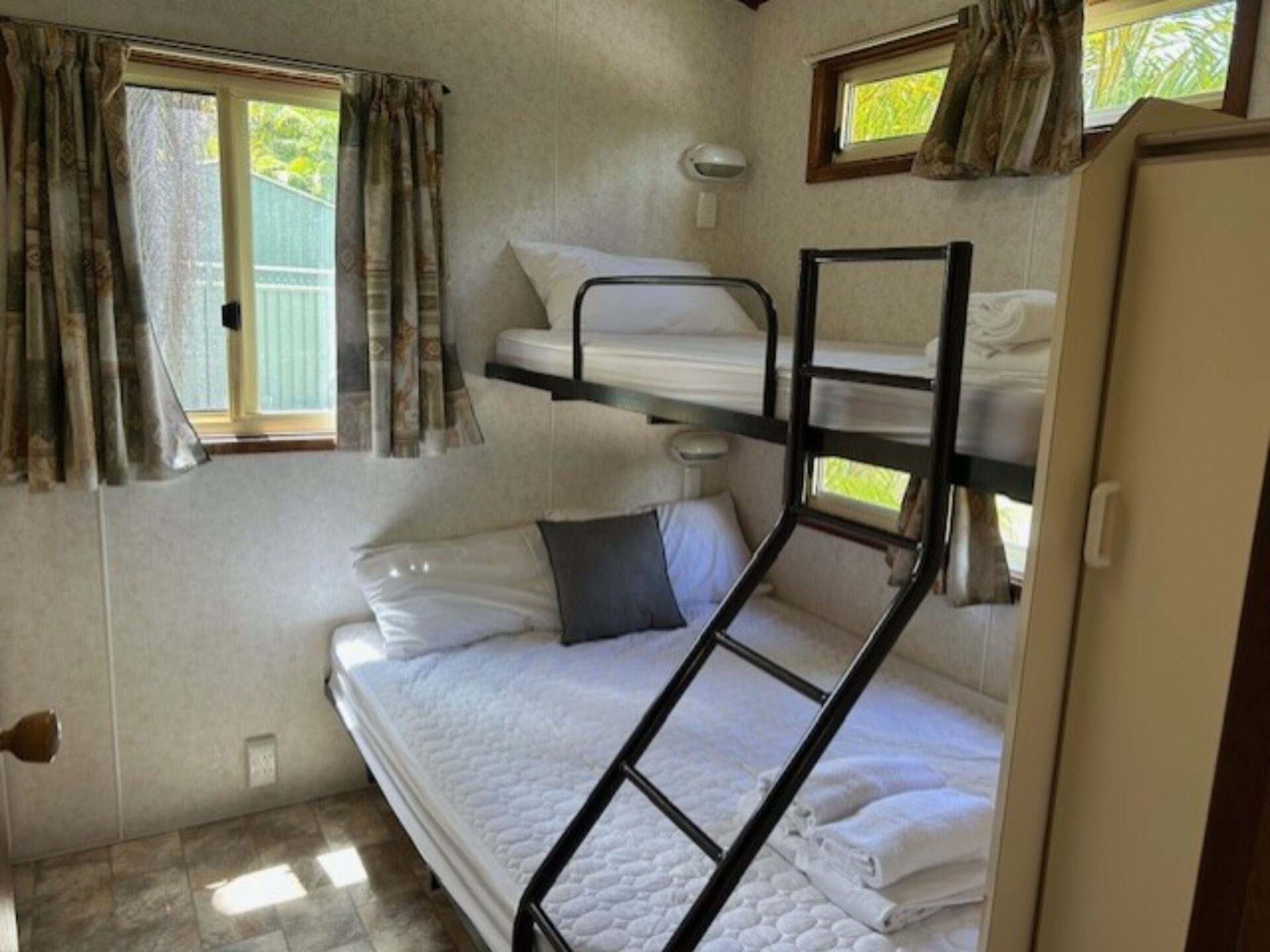This pet-friendly one-bedroom cabin sleeps up to five guests, with a queen bed in the main area and a tri-bunk in the bedroom. It includes a private bathroom, reverse cycle air-conditioning, ceiling fan, and a TV. The kitchenette offers electric oven and stovetop, microwave, toaster, kettle and a full size fridge for easy meals. Pets are welcome—please contact the park for approval and applicable fees.