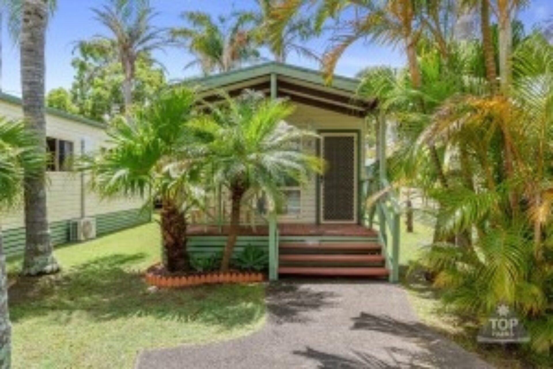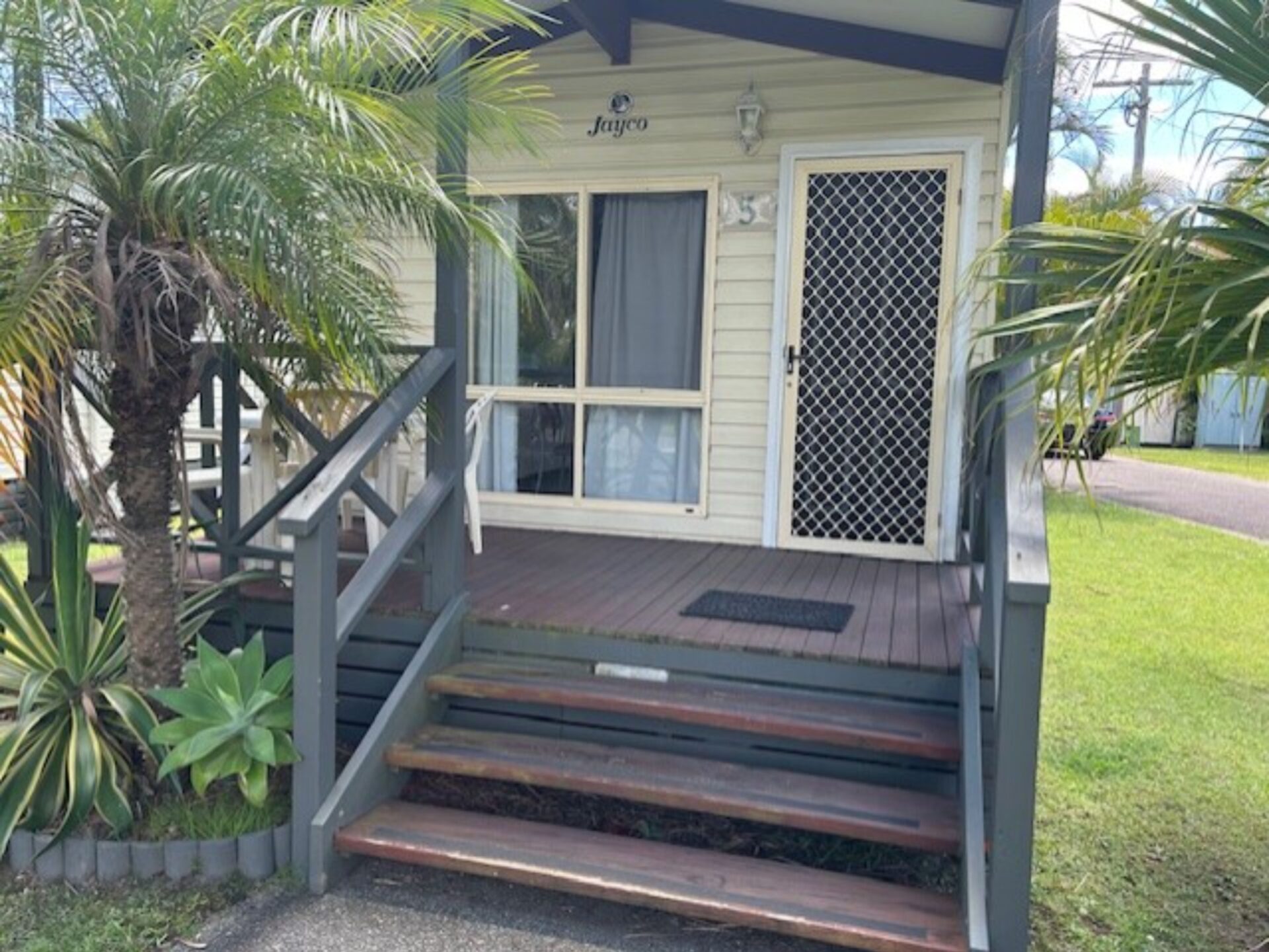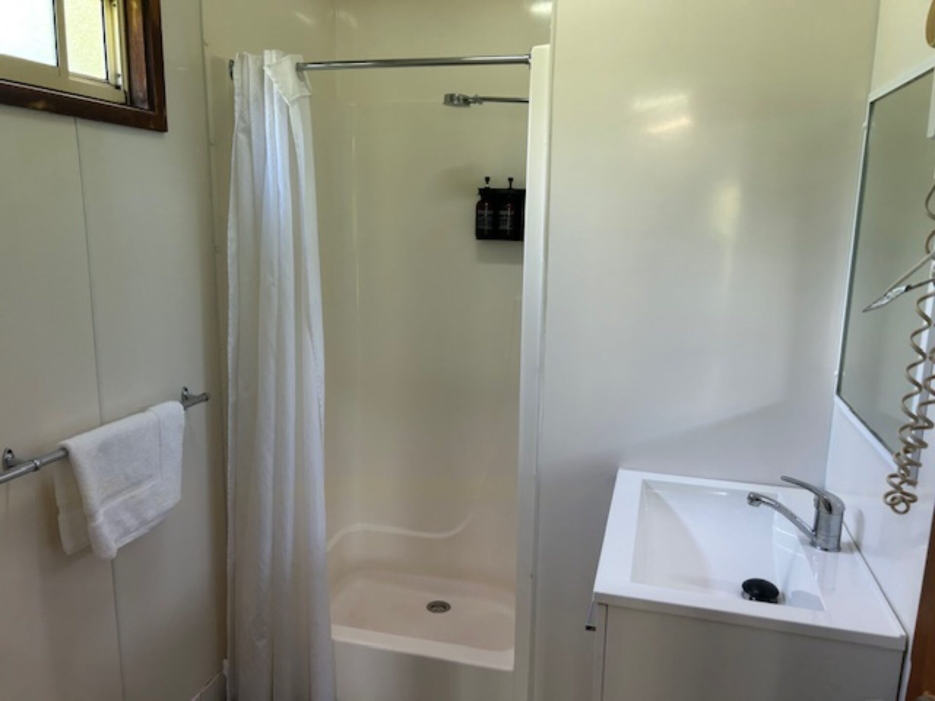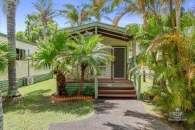 This pet-friendly one-bedroom cabin sleeps up to five guests, with a queen bed in the main area and a tri-bunk in the bedroom. It includes a private bathroom, reverse cycle air-conditioning, ceiling fan, and a TV. The kitchenette offers electric oven and stovetop, microwave, toaster, kettle and a full size fridge for easy meals. Pets are welcome—please contact the park for approval and applicable fees.