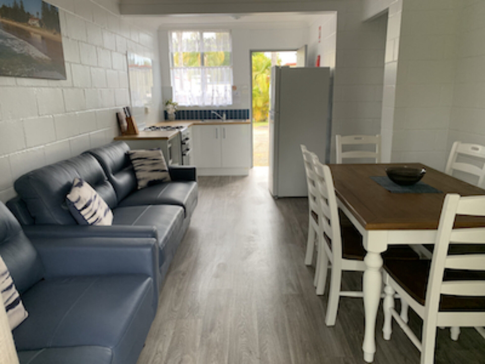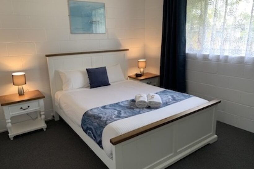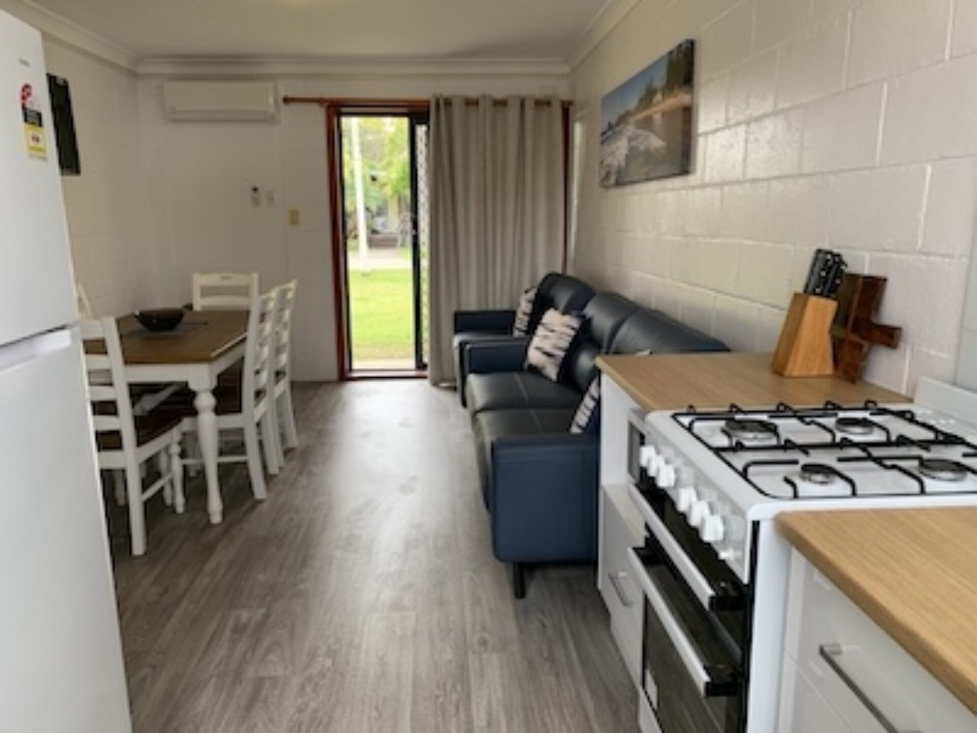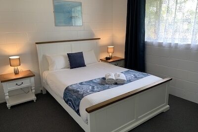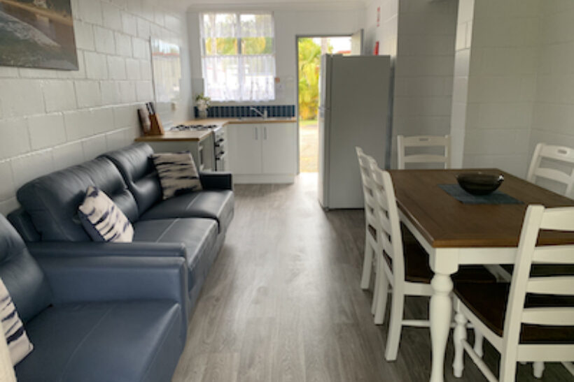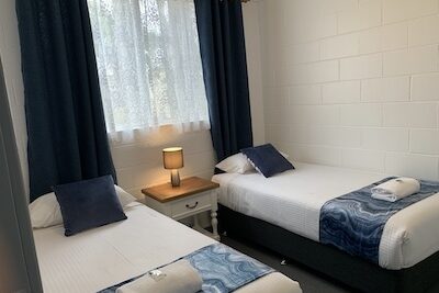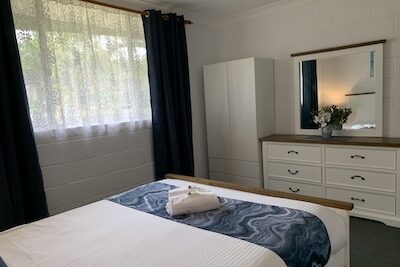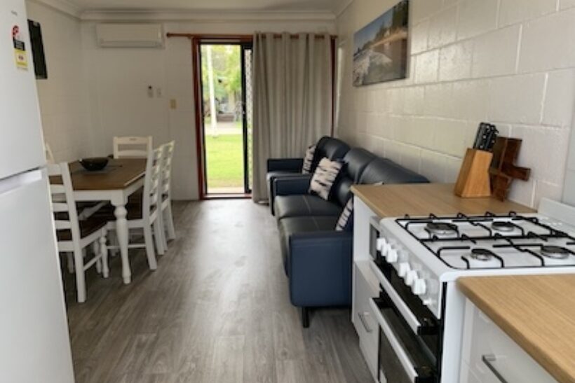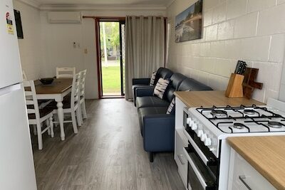 Ideal for families or small groups, this two-bedroom unit sleeps up to five guests with a queen bed, single bed, and bunk beds across two rooms. It features a separate lounge and private bathroom. The full kitchen offers gas oven and stovetop, microwave, toaster, kettle and a full size fridge for easy meal prep. With reverse cycle air-conditioning, fan, TV, and dining space, it offers a comfortable and practical stay.
